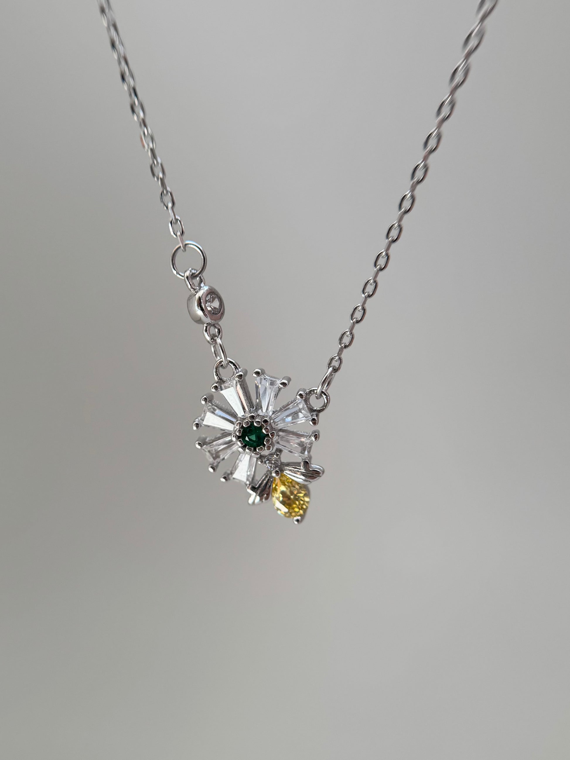 Inspired by flower beauty, this necklace features an flower yellow stone embraced by delicate solitaire and motifs. It is double layred chain necklace