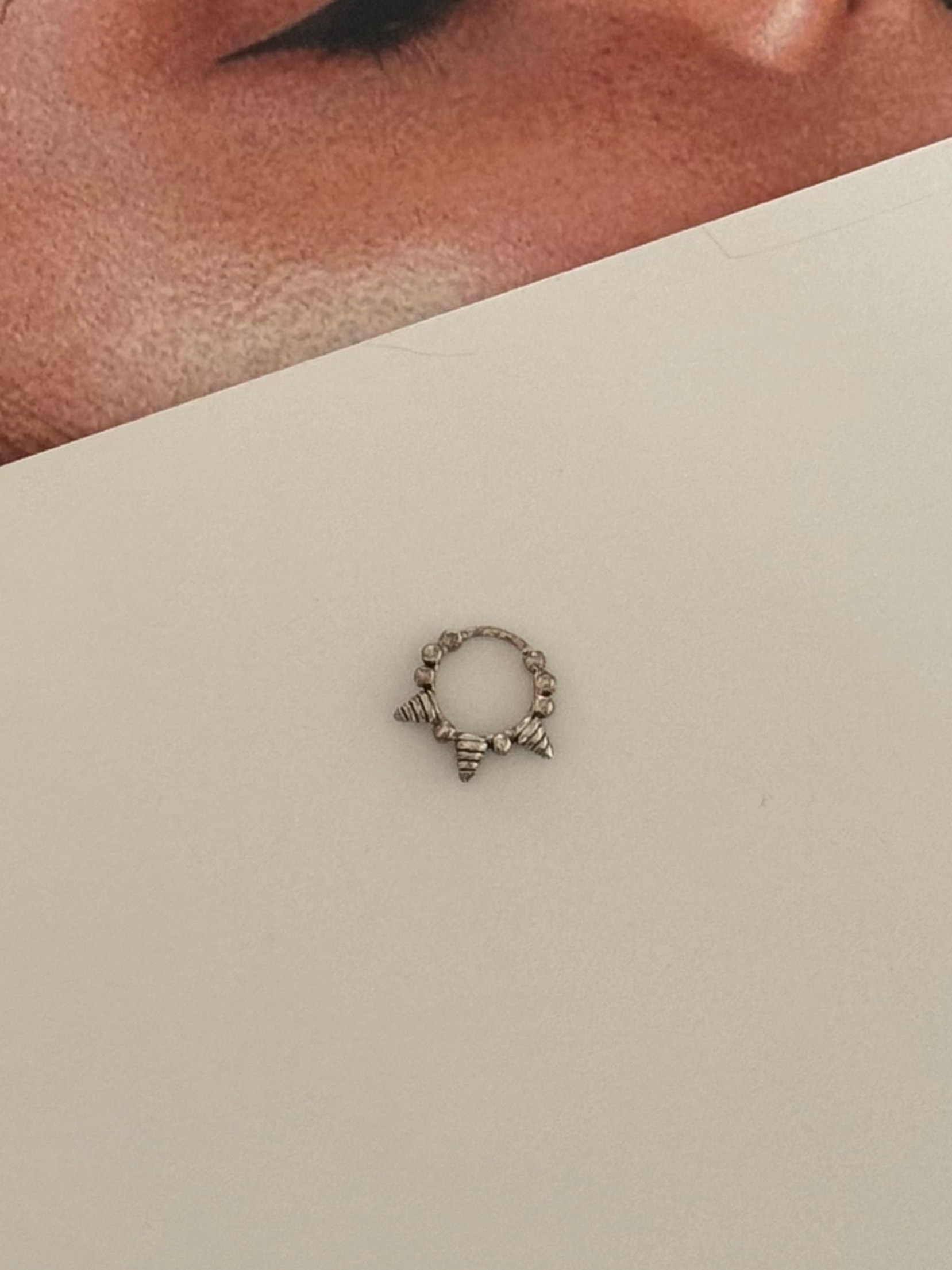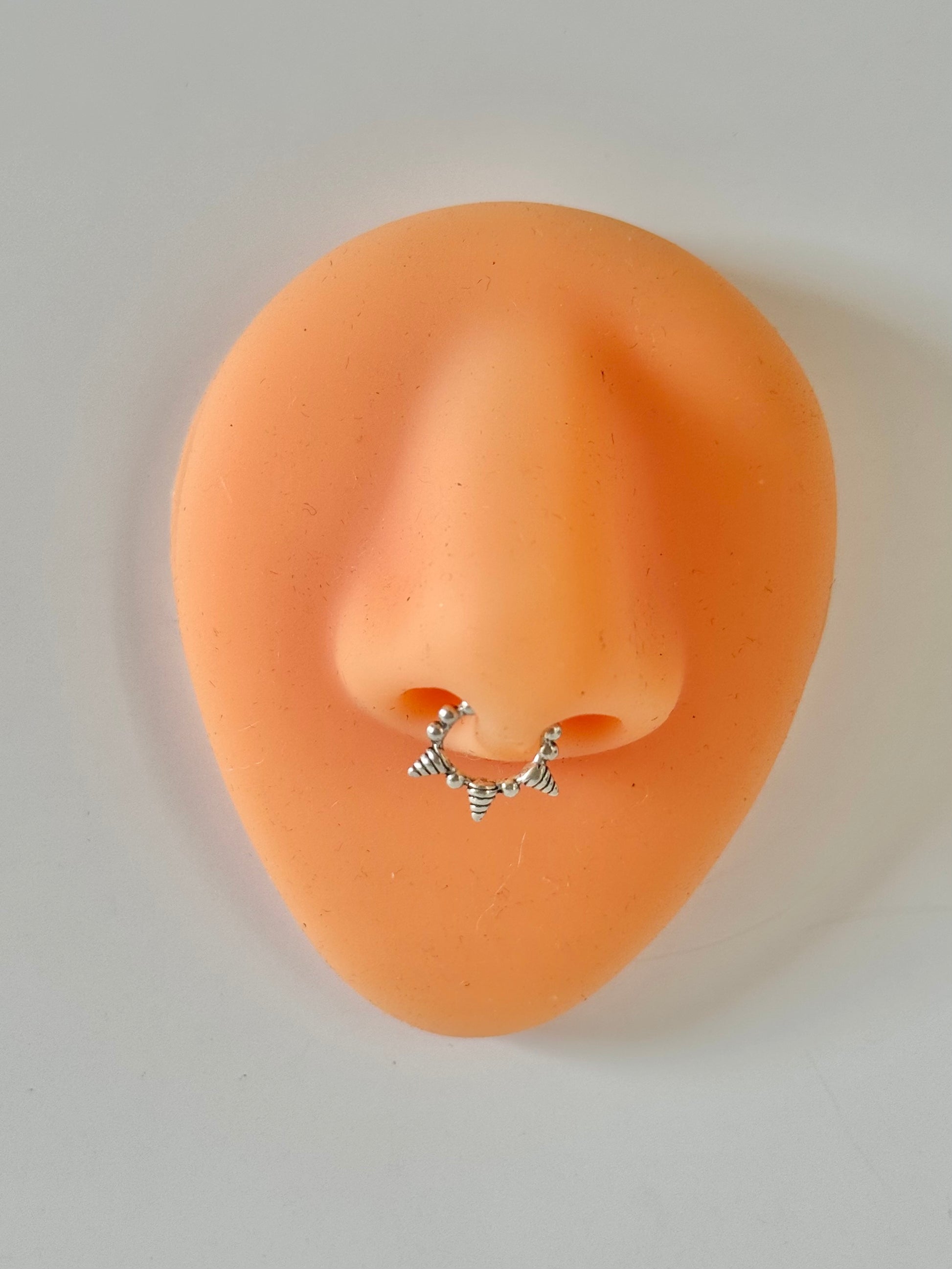 Introducing "Ariel," the ultimate septum ring for everyday wear. Crafted from hypoallergenic 92.5 sterling silver, Ariel is designed to withstand daily wear with its anti-tarnish and water-resistant properties. Featuring subtle yet striking thorn accents, this septum ring adds a touch of edgy sophistication to any pierced nose. Perfect for those seeking a durable and stylish accessory that seamlessly complements their unique style.