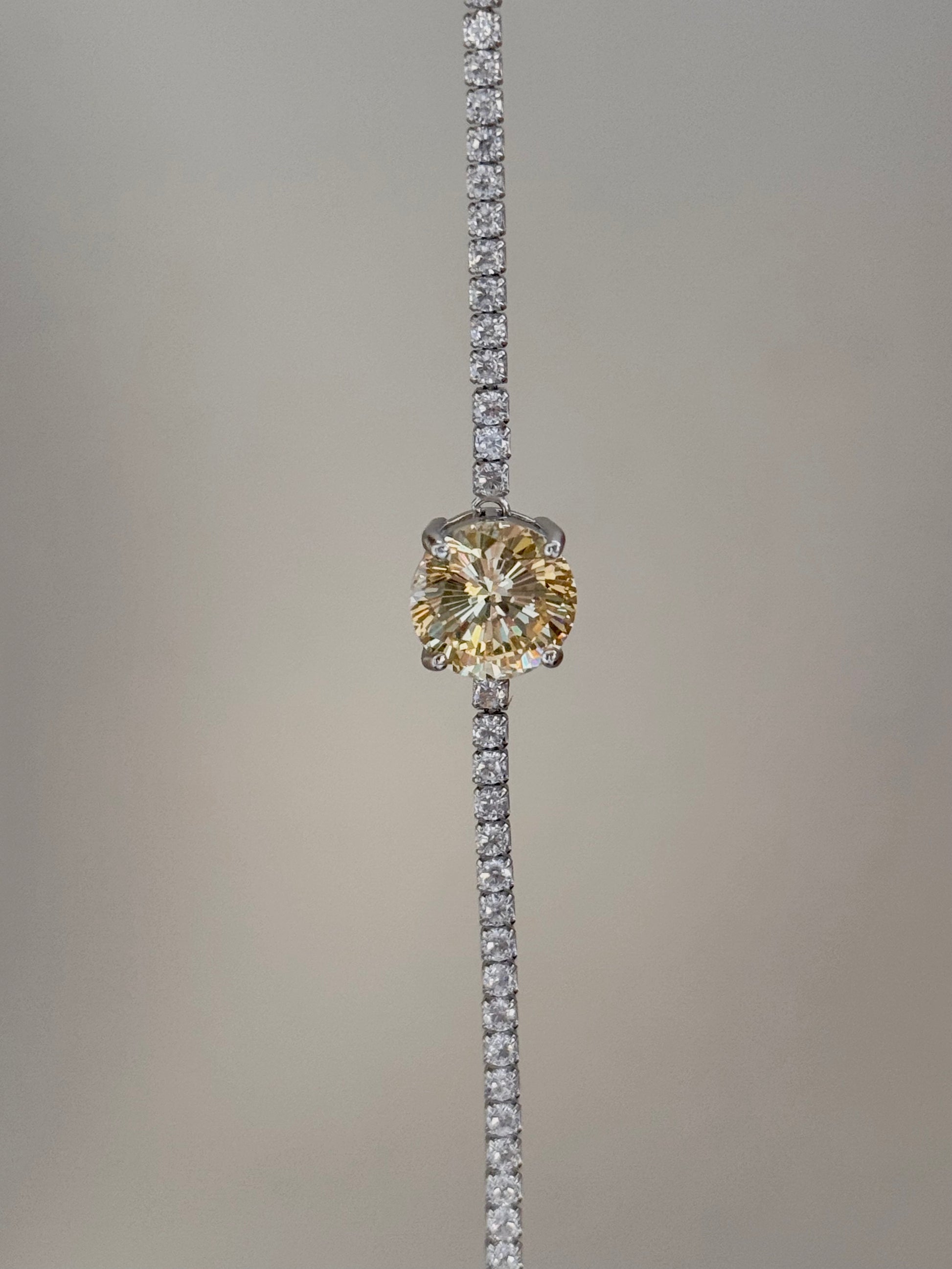 Canary Bracelet is a classic tennis bracelet featuring a striking yellow sapphire-inspired round stone at its center. Its timeless design blends beauty with elegance, making it a versatile piece that effortlessly transitions from everyday sophistication to statement jewelry for special occasions.