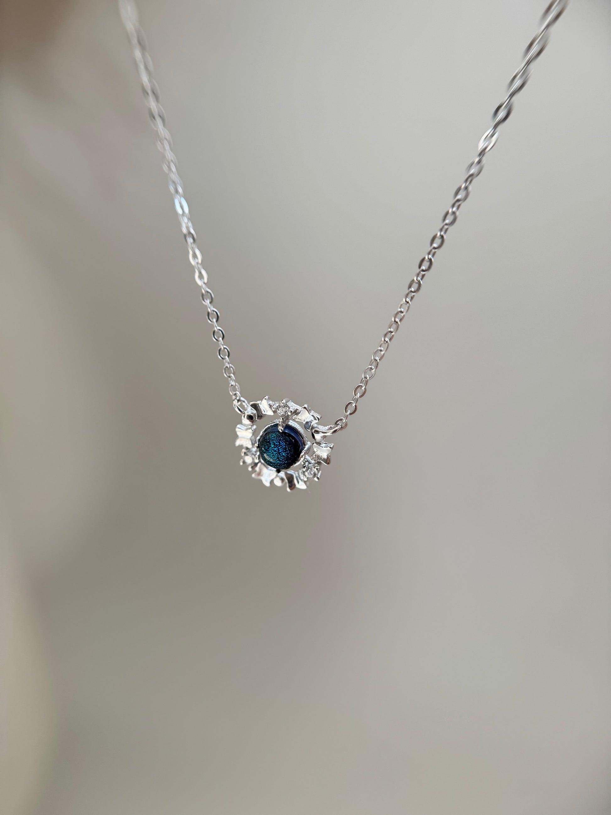Inspired by celestial beauty, this necklace features an aqua blue stone embraced by delicate sun and moon motifs.