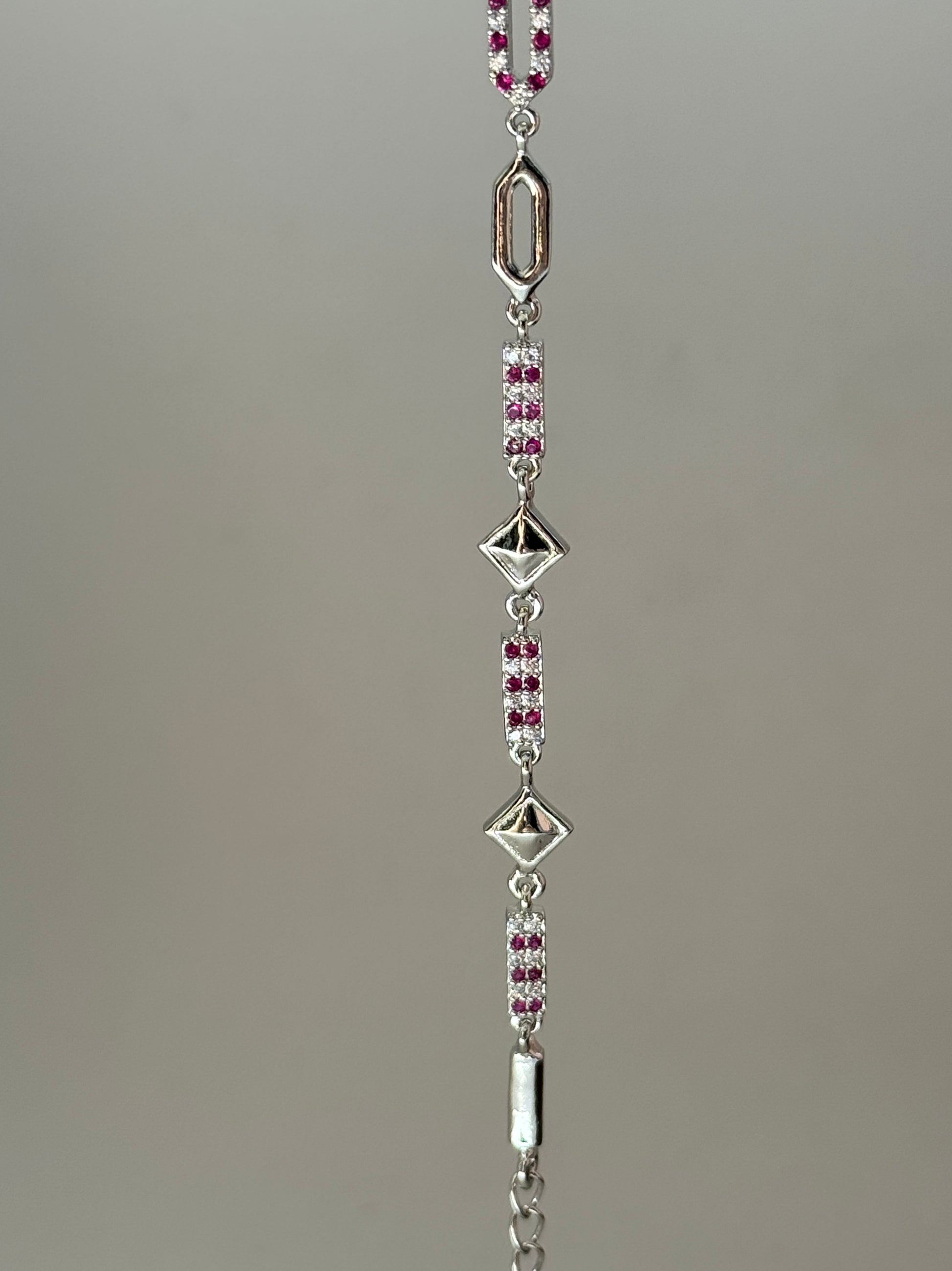 The Crimson Bracelet showcases an artistic blend of kite motifs and paperclip with red stones and adorned with white CZ stones to sleek silver-filled designs Linked together, these elements create a sophisticated bracelet that’s both modern and timeless