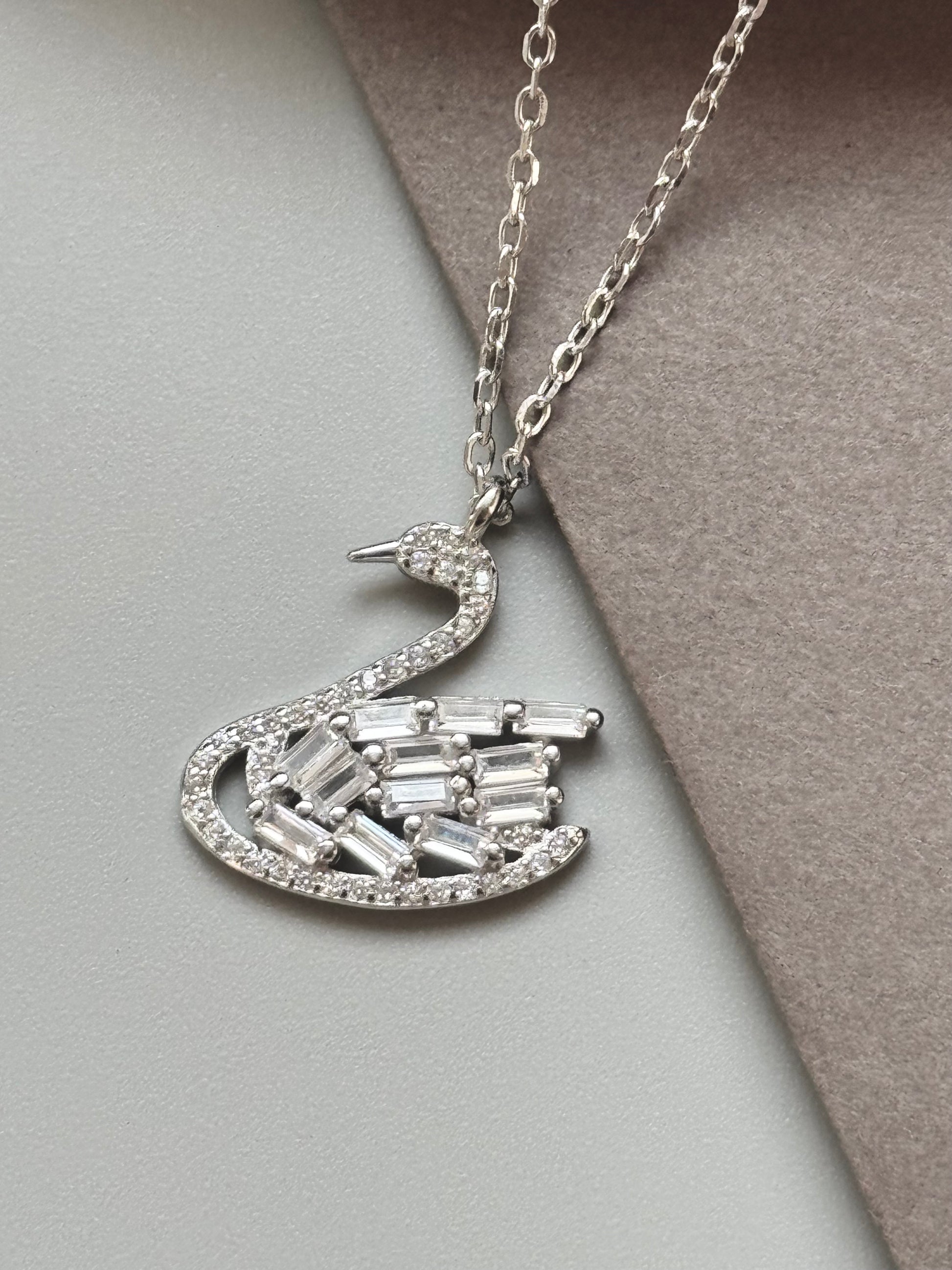 A timeless swan pendant crafted in 92.5 sterling silver, adorned with baguette-cut CZ stones for a sparkling finish. Waterproof, anti-tarnish, and skin-friendly—perfect for daily wear with a touch of elegance if out with friends, family.