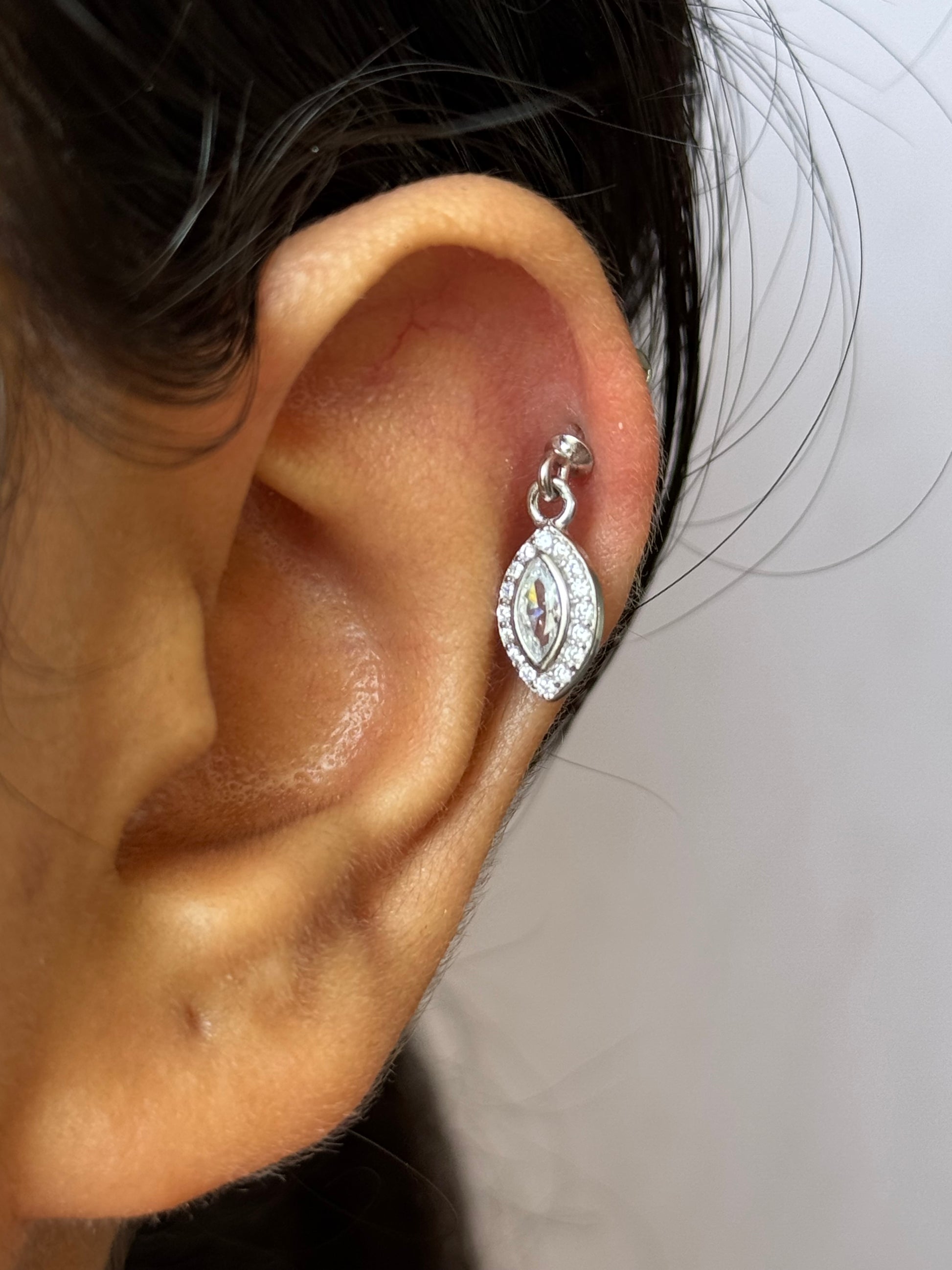 the Elysian Drop Helix Earring — a refined teardrop silhouette featuring a marquise-cut center stone encased in a halo of micro pavé zirconia. Made from premium 92.5 sterling silver, this piece brings a timeless sparkle to your helix or cartilage piercing with its delicate movement and dazzling shine.