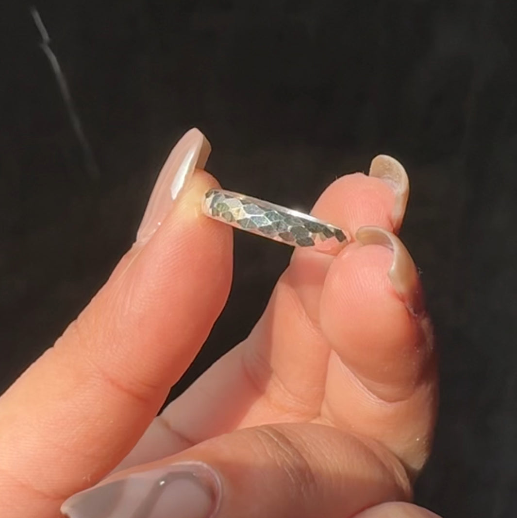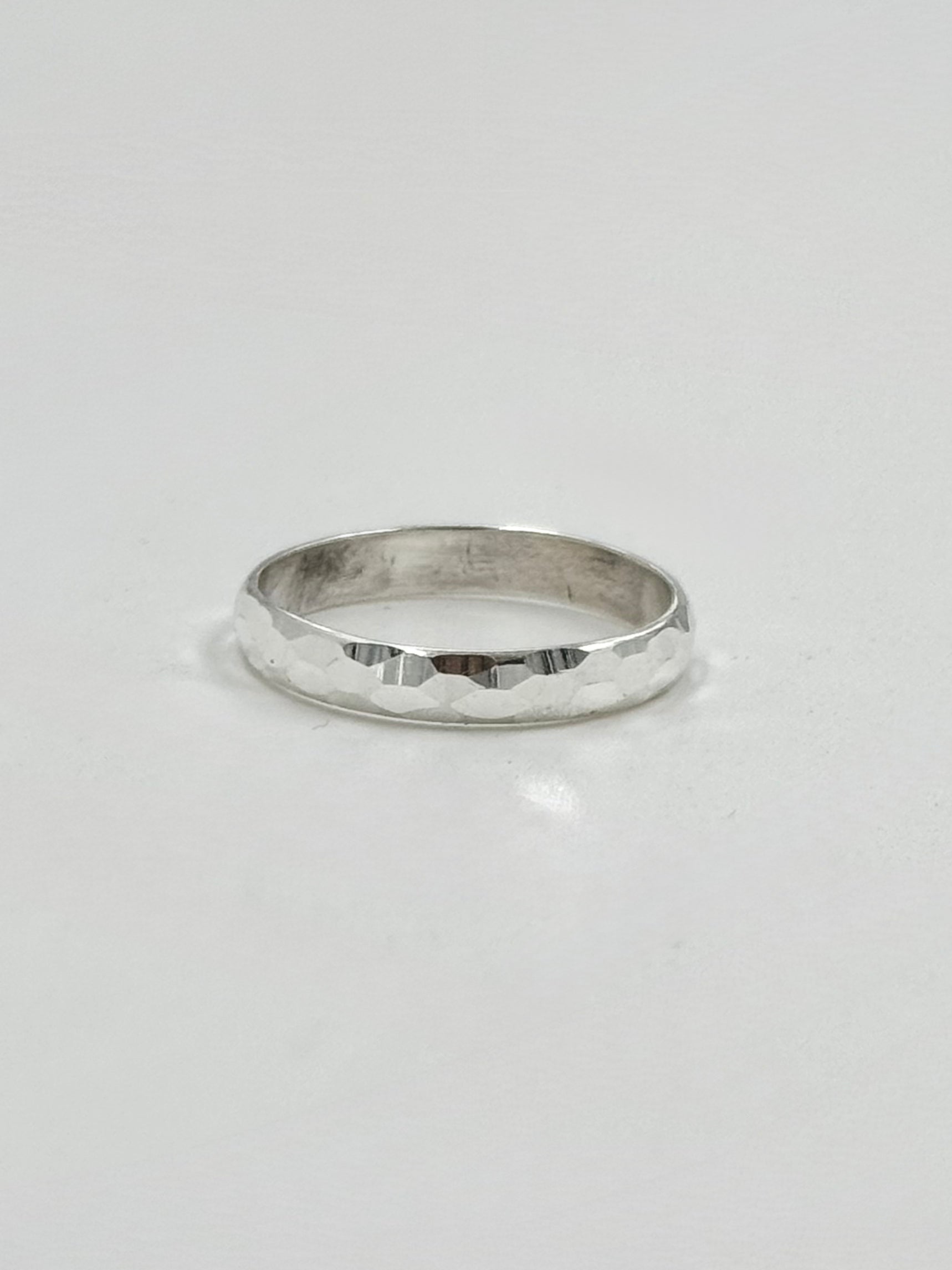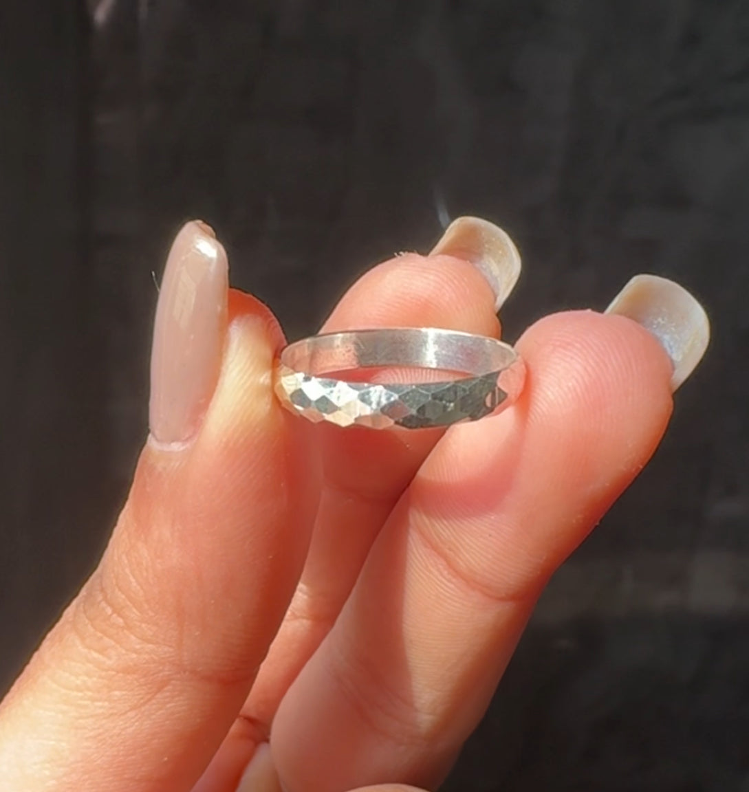 hammered half-round silver ring is a stylish and distinctive piece of jewelry that combines the unique profile of a half-round design with the textural beauty of a hammered finish. It is a testament to skilled craftsmanship and offers a personalized touch for those seeking a one-of-a-kind accessory. Made up of 92.5 sterling silver material.