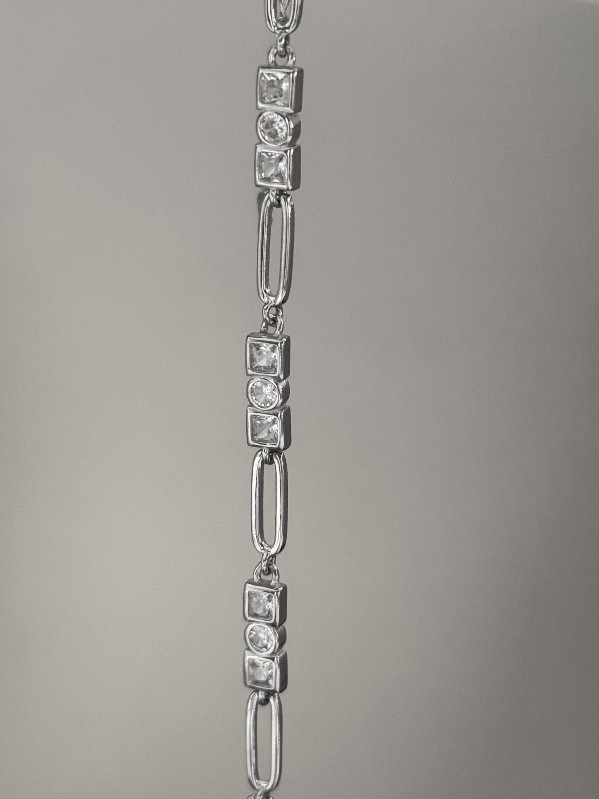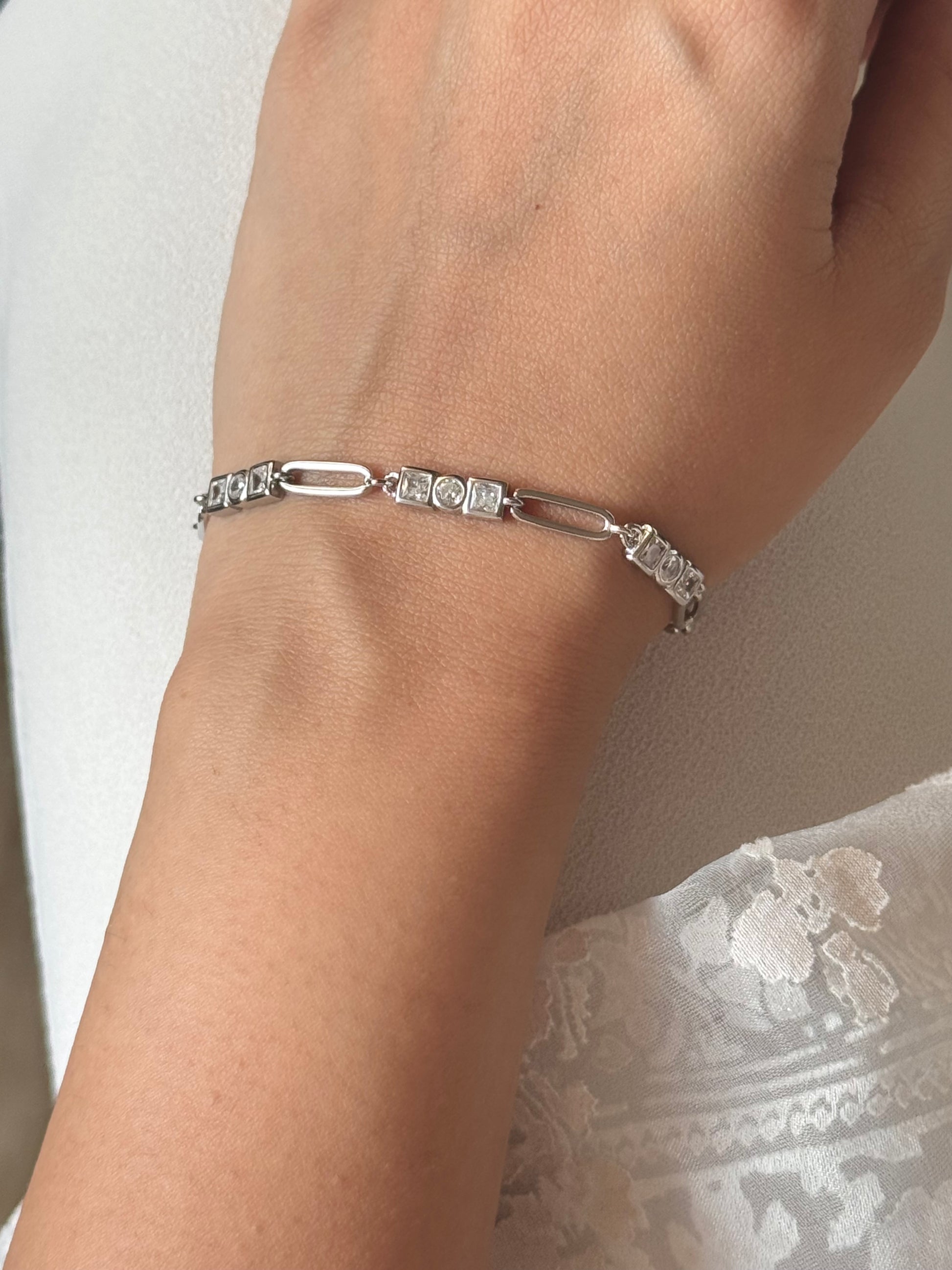The Ignite Bracelet is a chic paperclip-style design, featuring alternating large links adorned with shimmering baguette-cut and round CZ stones. A perfect balance of elegance and modern edge.