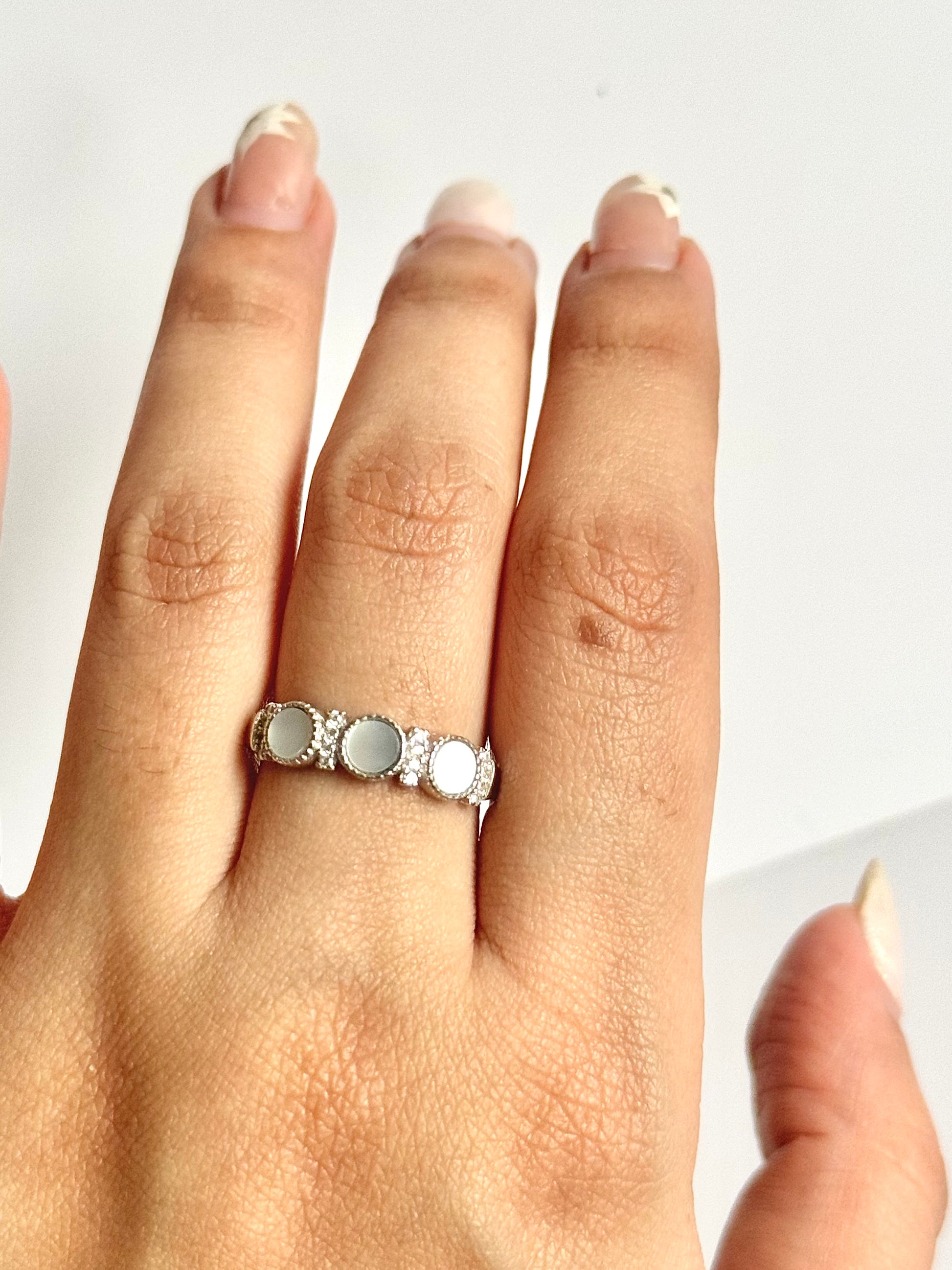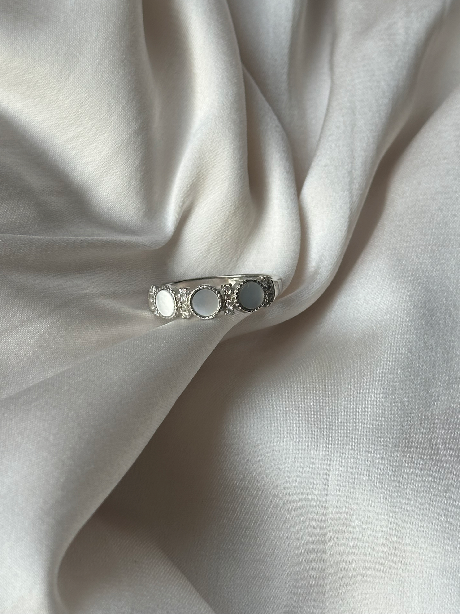 The Iridesca ring is a breathtaking fusion of elegance and charm, featuring three luminous round mother-of-pearl stones, each surrounded by sparkling CZ stones. Crafted from 92.5% sterling silver, this versatile piece radiates timeless beauty and sophistication. Its ethereal glow and intricate detailing make it perfect for both everyday wear and special occasions. Whether you're treating yourself or gifting it to a loved one, Iridesca is a symbol of grace and refinement, sure to leave a lasting impression.