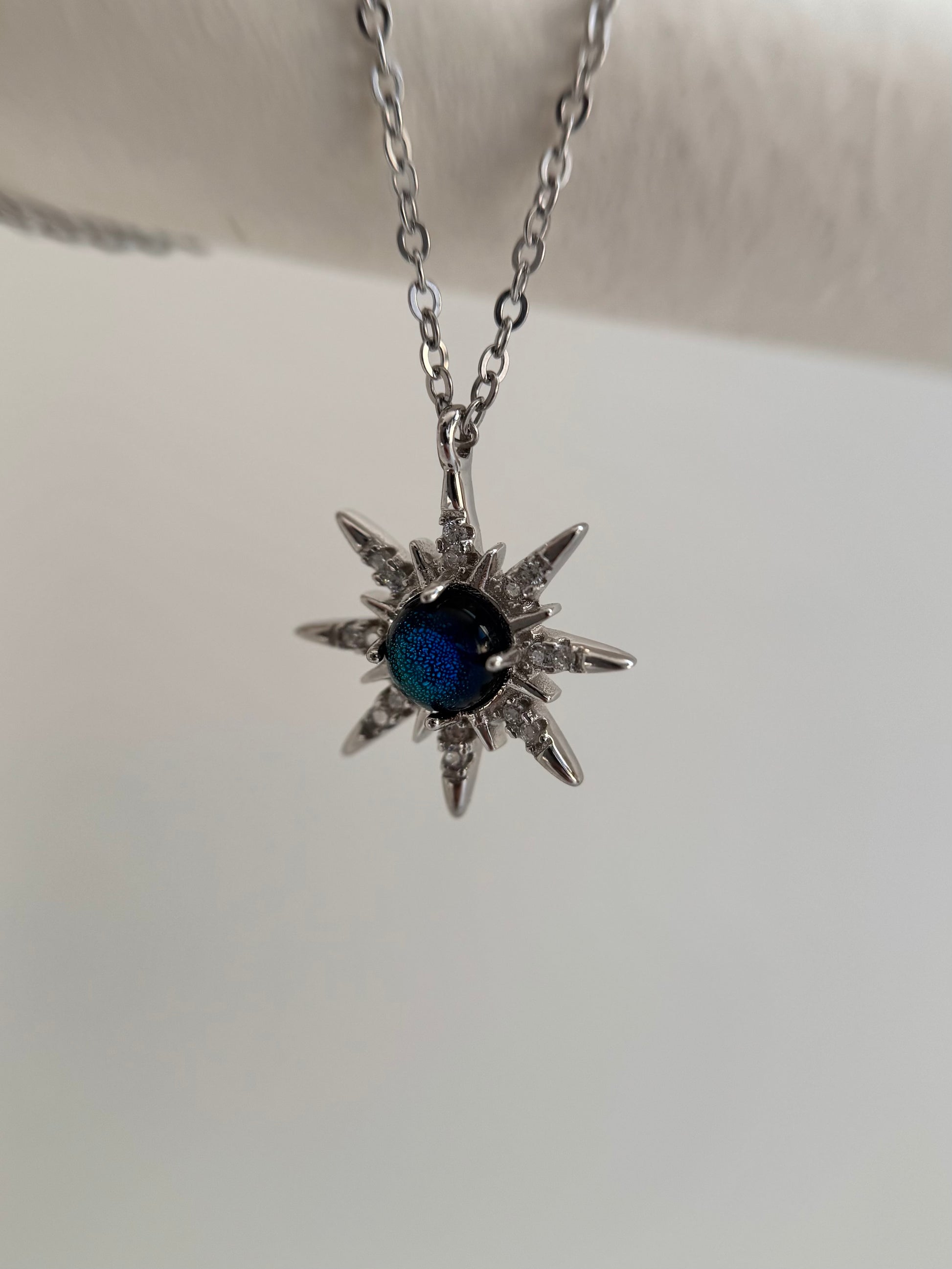 Inspired by celestial beauty, this necklace features an aqua blue stone embraced by delicate sun and moon motifs.
