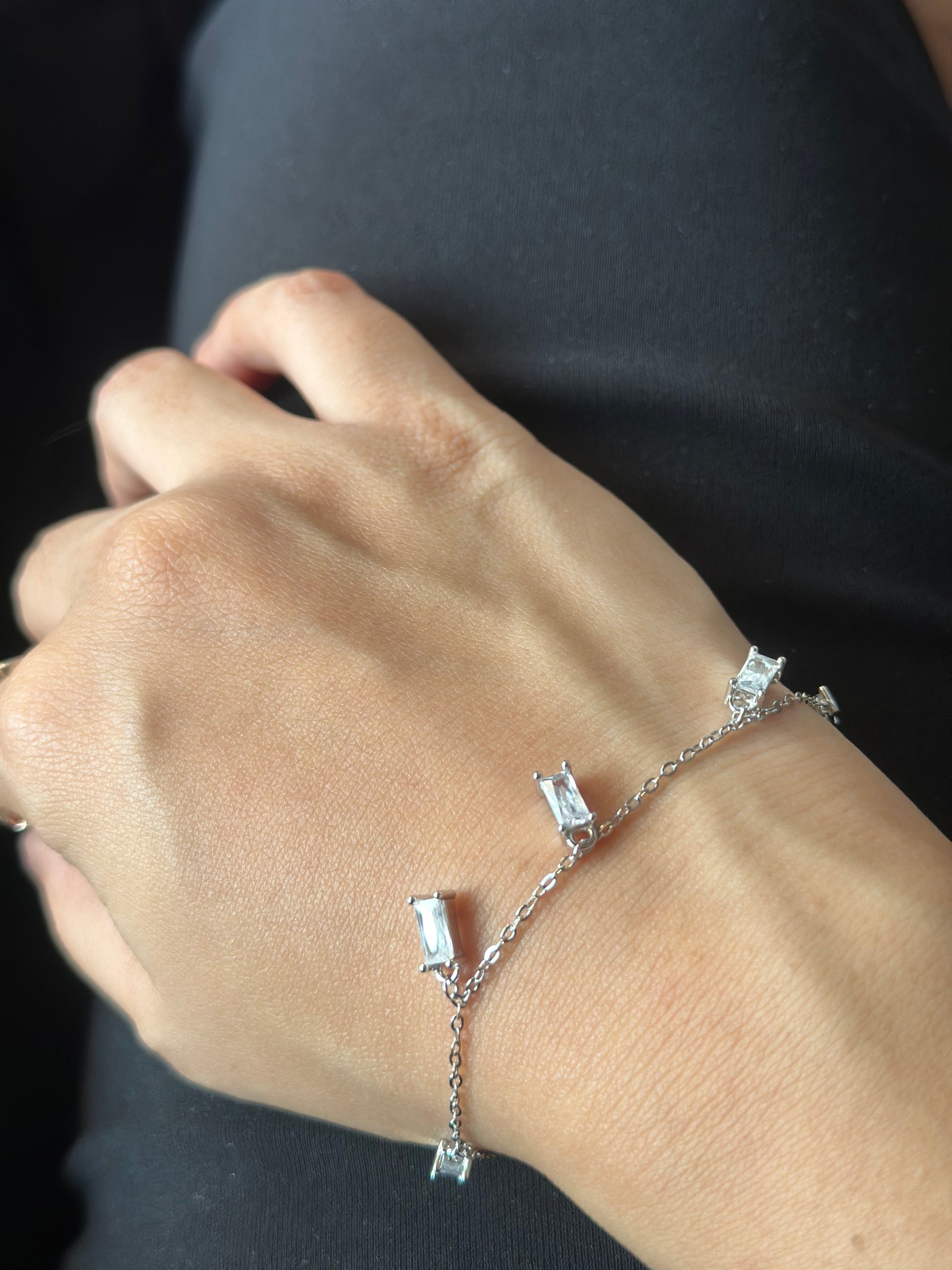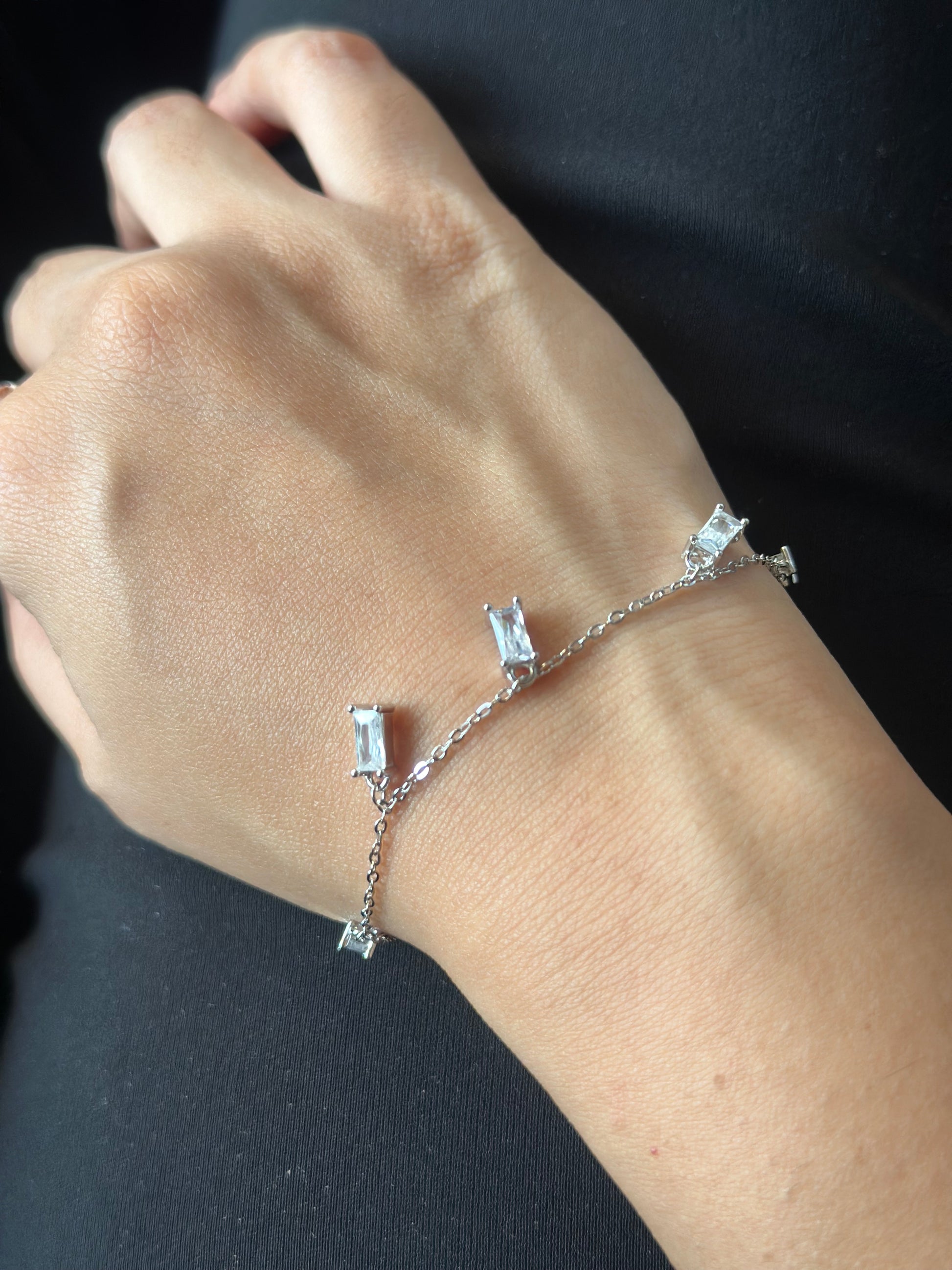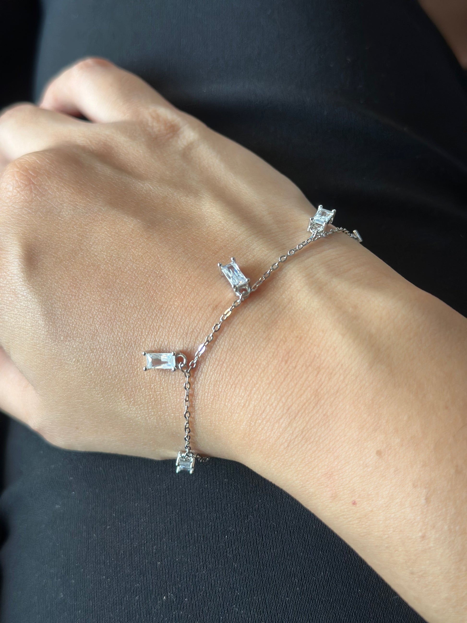 The Malachite bracelet has a fine silver chain adorned with evenly spaced tiny princess solitaire motifs, giving it a dainty yet playful charm. Its minimalist starry design makes it perfect for stacking or wearing solo for a subtle sparkle.