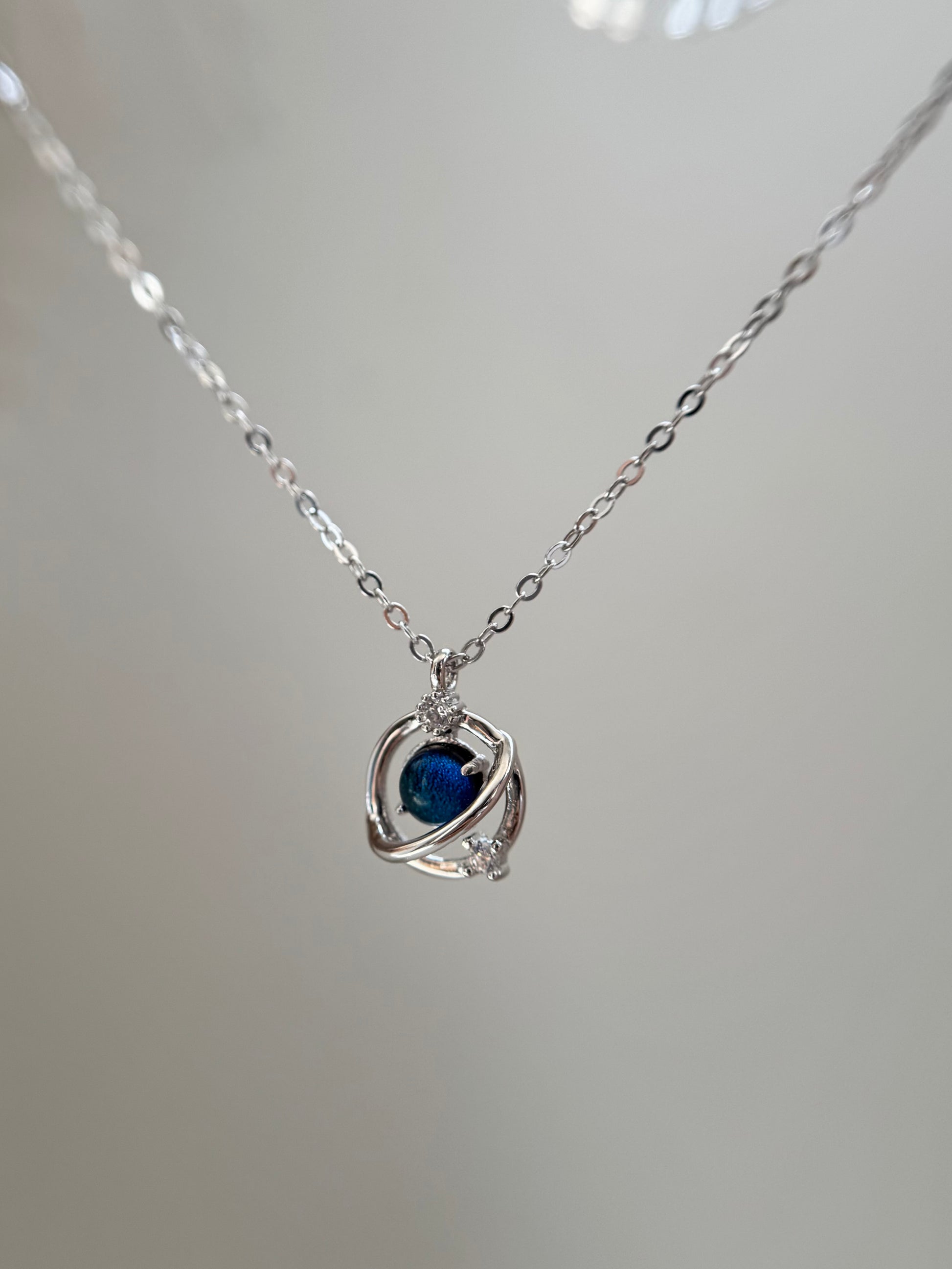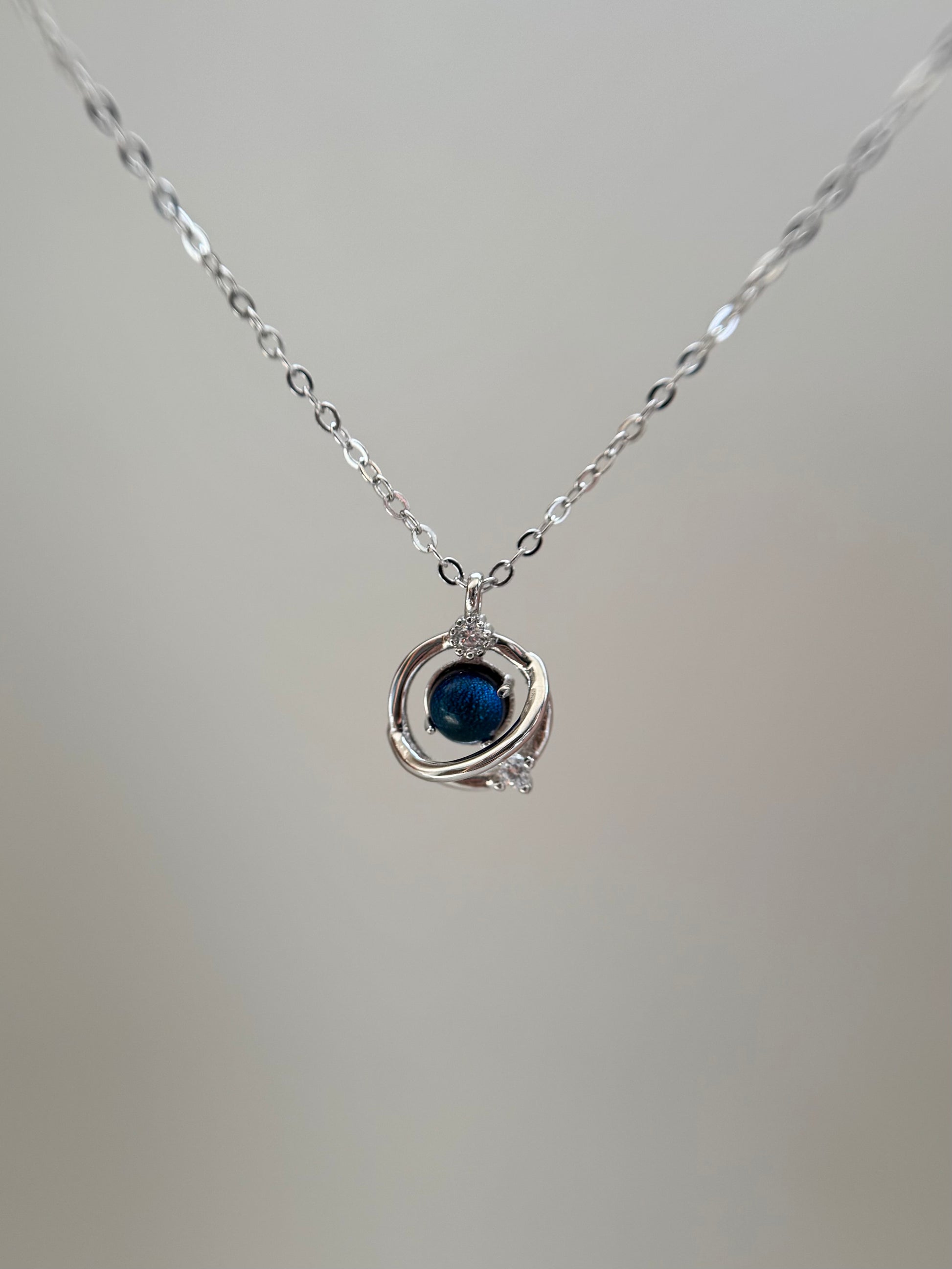 Inspired by celestial beauty, this necklace features an aqua blue stone embraced by delicate sun and moon motifs.