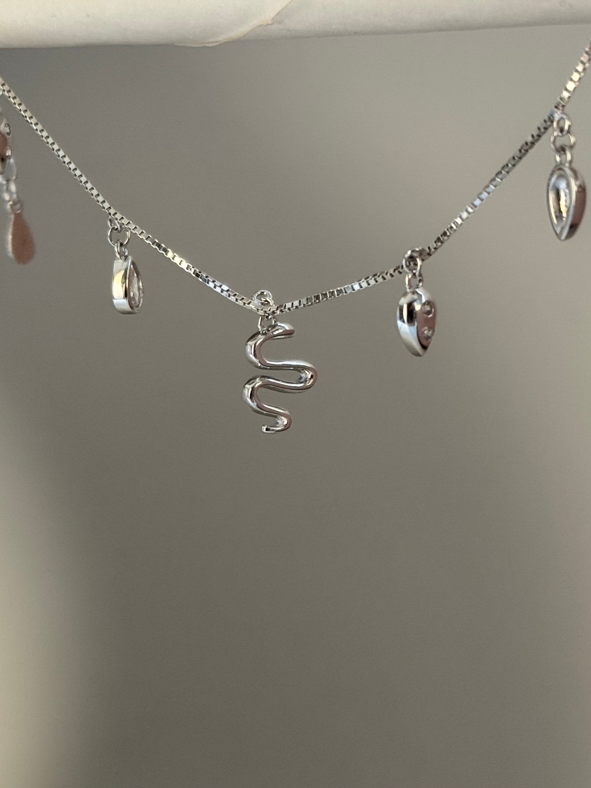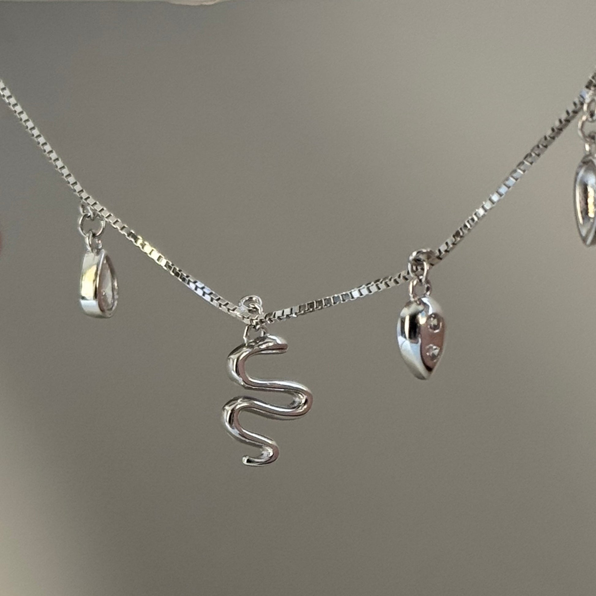 The Ophis bracelet features a sleek silver chain with dangling teardrop-shaped charms, each set with a sparkling stone for added elegance. Its fluid, minimal design gives it a graceful shimmer, making it perfect for both casual and dressy looks.