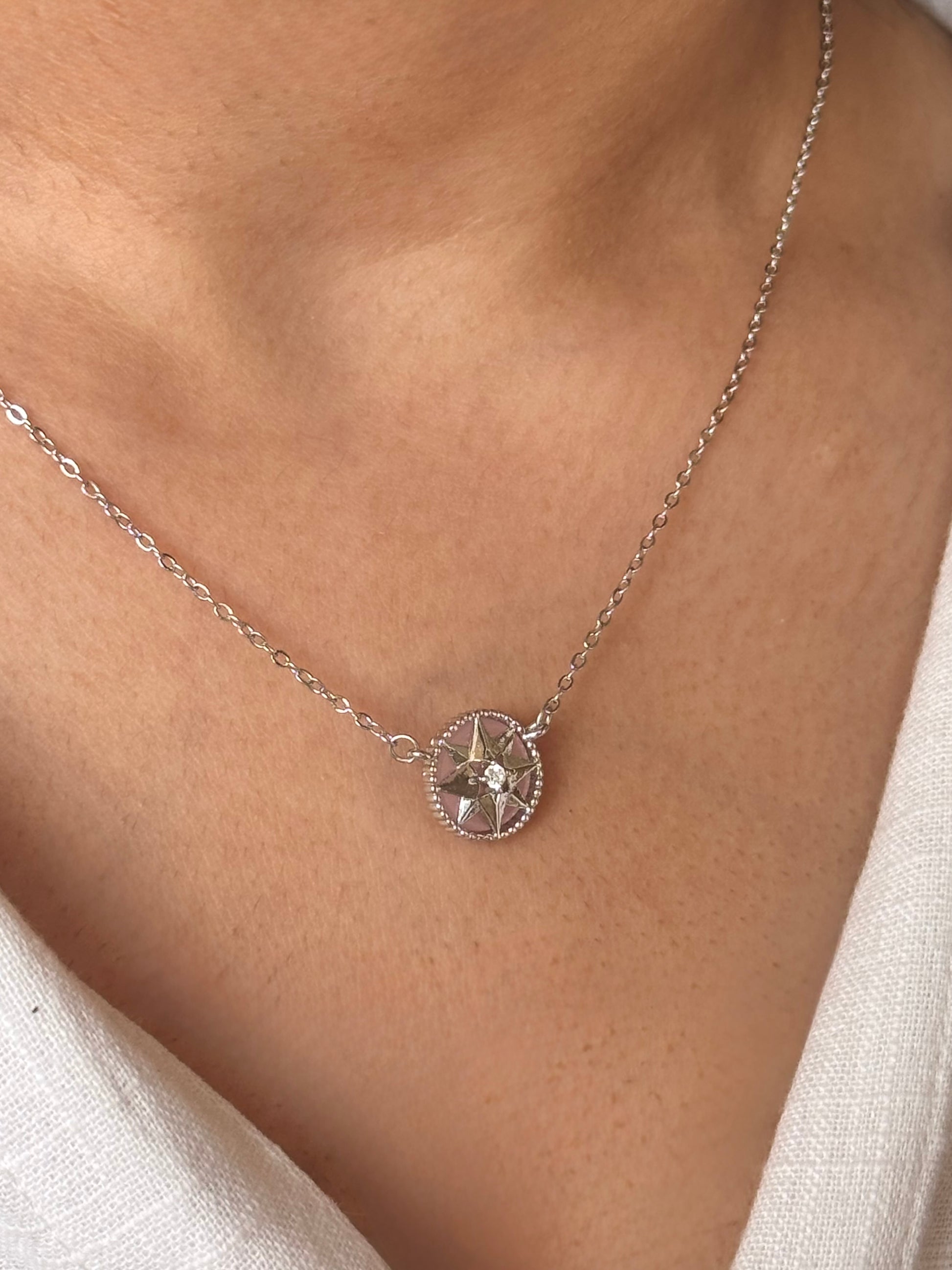 Crafted from 92.5 sterling silver, this necklace features a unique design that’s perfect for everyday wear or for adding a chic touch to any outfit, highlighted by a star in centerpiece with Pink Coloured Stone.