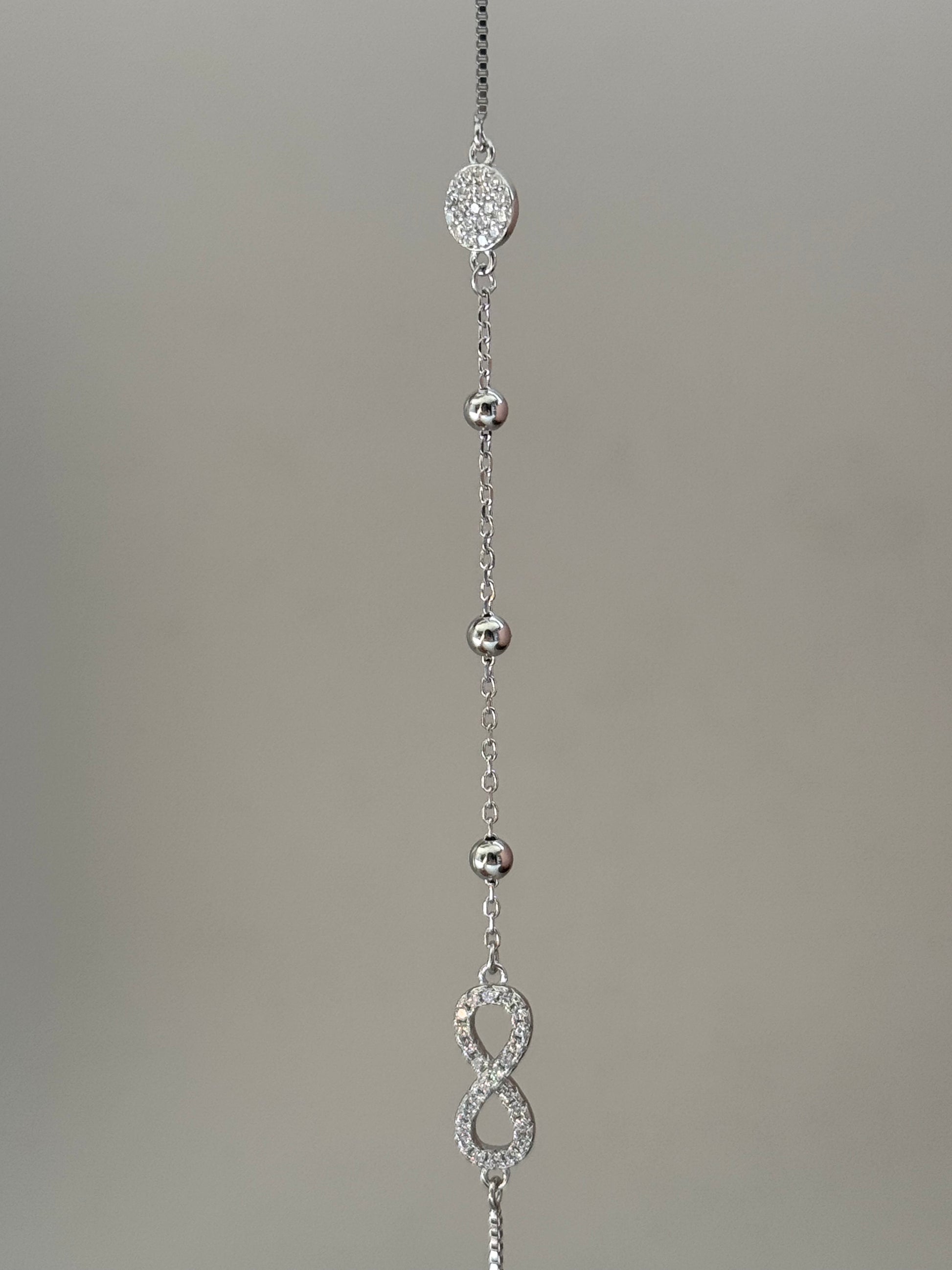 Stardrift is delicate bracelet features an elegant infinity symbol adorned with sparkling CZ stones, set on a fine, dainty chain. Its timeless design makes it a graceful and versatile piece, perfect for everyday wear or layering with other favorites.